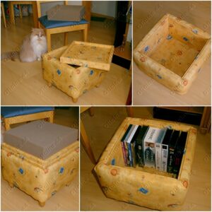 Usamos chapas de MDF fino por dentro do cubo para esconder os grampos, tivemos dificuldade para forrar a almofada de cima, pois não sei costurar nem tinha máquina.