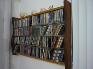 Mesmo com as dificuldades fomos pegando gosto pela coisa, tínhamos uma estante com laterais onduladas e Zé Luiz teve a idéia de fazer um porta CD com laterais onduladas também, esse projeto mereceu duas versões. A primeira com mdf e chapa fina de compensado no fundo e nas divisórias, anos depois a segunda versão com laterais de ipê, meio de pinus, divisórias de acrílico e sem o fundo