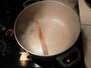 A madeira tem que ser fervida ou cozida no vapor, (que é ainda melhor, mas irá necessitar de mais tempo e vapor suficiente). Quando iniciar a fervura, coloque a tira dentro e tampe a panela. Reduza o fogo e cozinhe por cinco minutos.